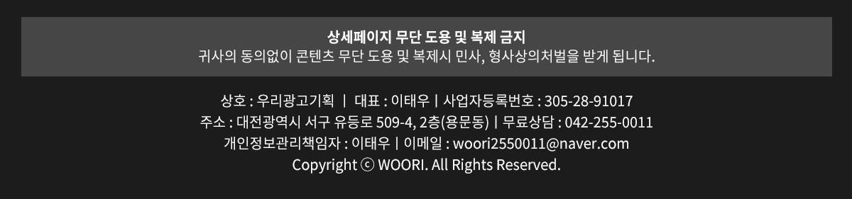 우리광고기획는(이하‘회사’는) 고객님의 개인정보를 중요시하며, “개인정보보호법”, “정보통신망 이용촉진 및 정보보호에 관한 법률” 등 관련법규를 준수하고 있습니다.